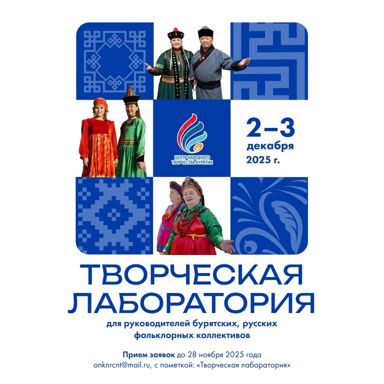 Республиканский центр народного творчества объявляет приём заявок на участие в творческой лаборатории для руководителей бурятских, русских фольклорных и народных художественных коллективов, которая пройдёт с 2 по 3 декабря. Мероприятие организовано в соответствии с планом учебных мероприятий центра.