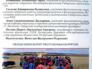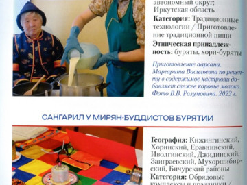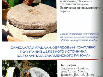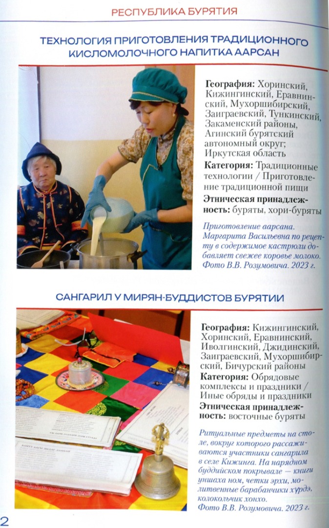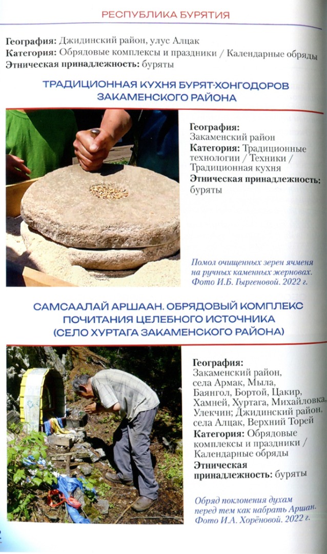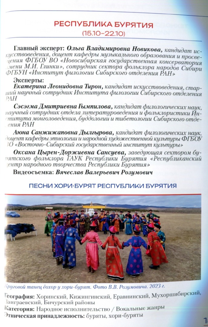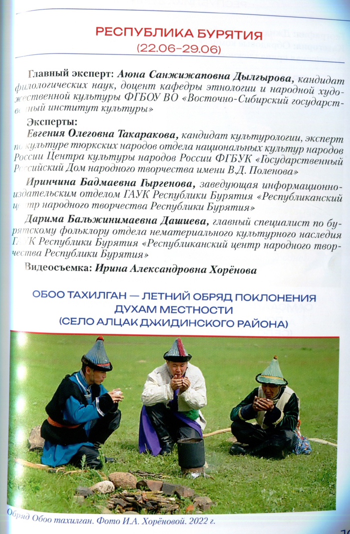 Кроме того, в издании представлены сведения обо всех экспедиционных выездах, которые были проведены в течение первых трех лет (2022–2024 гг.) проекта «Цикл фольклорных экспедиций по выявлению объектов нематериального этнокультурного достояния народов России». Так в Бурятии экспедиции состоялись в июне 2022 г. и октябре 2023 г.