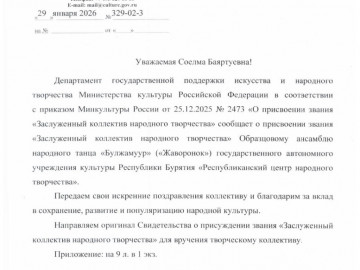 В сопроводительном письме на имя Министра культуры Республики Бурятия Соелмы Дагаевой директор Департамента государственной поддержки искусства и народного творчества Минкультуры России Анна Грибанова передала искренние поздравления артистам и поблагодарила коллектив за вклад в сохранение, развитие и популяризацию народной культуры. К письму приложен оригинал Свидетельства о присвоении почётного звания.