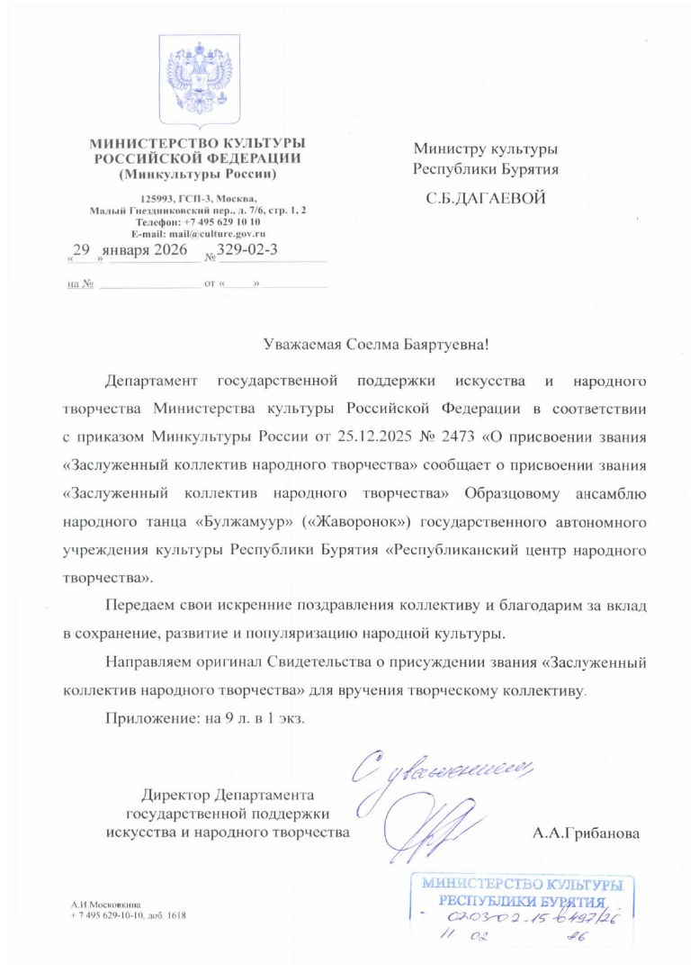 В соответствии с Приказом Министерства культуры РФ от 25.12.2025 № 2473 «О присвоении звания «Заслуженный коллектив народного творчества» почётного звания удостоен Образцовый ансамбль народного танца «Булжамуур» Республиканского центра народного творчества. Соответствующий приказ подписан Министром культуры Российской Федерации Ольгой Любимовой 25 декабря 2025 года. Официальное свидетельство о присвоении звания направлено в адрес Министерства культуры Республики Бурятия для вручения коллективу.
