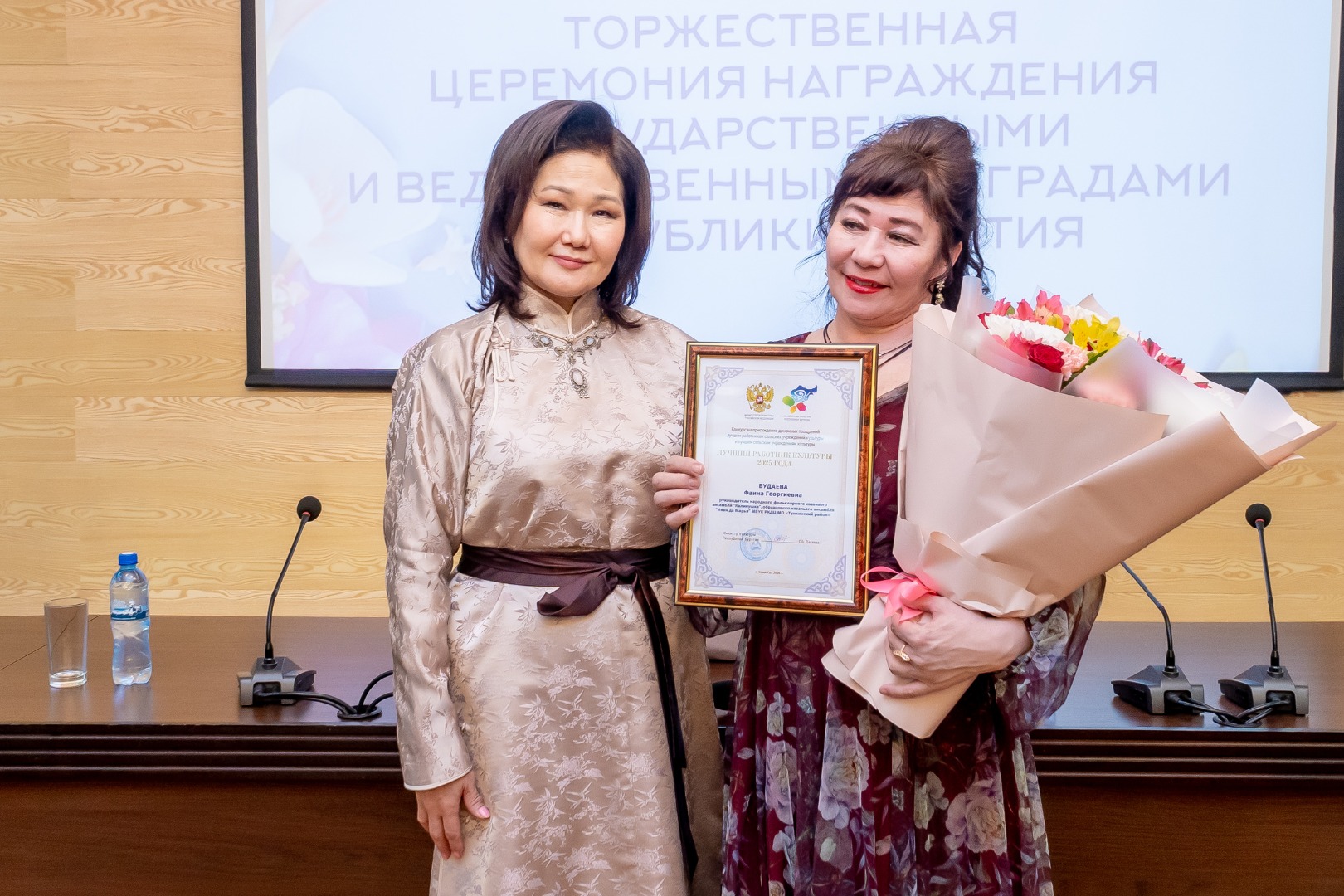- Будаева Фаина Георгиевна, хормейстер народного фольклорного ансамбля «Калинушка», хормейстеру детского образцового ансамбля «Иван-да-Марья» муниципального бюджетного учреждения культуры «Районный культурно-досуговый центр» (МО «Тункинский район РБ);
