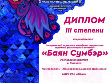 Народный фольклорный ансамбль «Баян Сумбэр» Муниципального бюджетного учреждения культуры «Районный Дом культуры «Одон» Кижингинского района удостоен звания лауреата III степени Всероссийского фестиваля-конкурса фольклорных ансамблей «Традиция». Художественный руководитель коллектива — Заслуженный работник культуры Республики Бурятия Дугарма Жамсаранова.