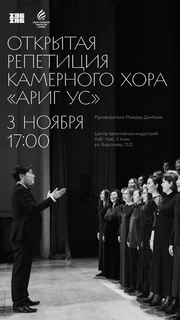 3 ноября в Центре креативных индустрий «Хэб—Хаб» пройдёт открытая репетиция Камерного хора «Ариг Ус» Республиканского центра народного творчества*.
