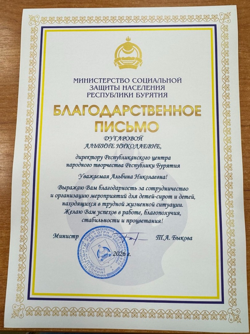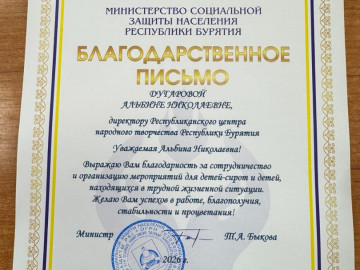 «Выражаем вам благодарность за сотрудничество и организацию мероприятий для детей-сирот и детей, находящихся в трудной жизненной ситуации. Желаем вам успехов в работе, благополучия и процветания!», – отметила министр социальной защиты населения Республики Бурятия Татьяна Быкова.