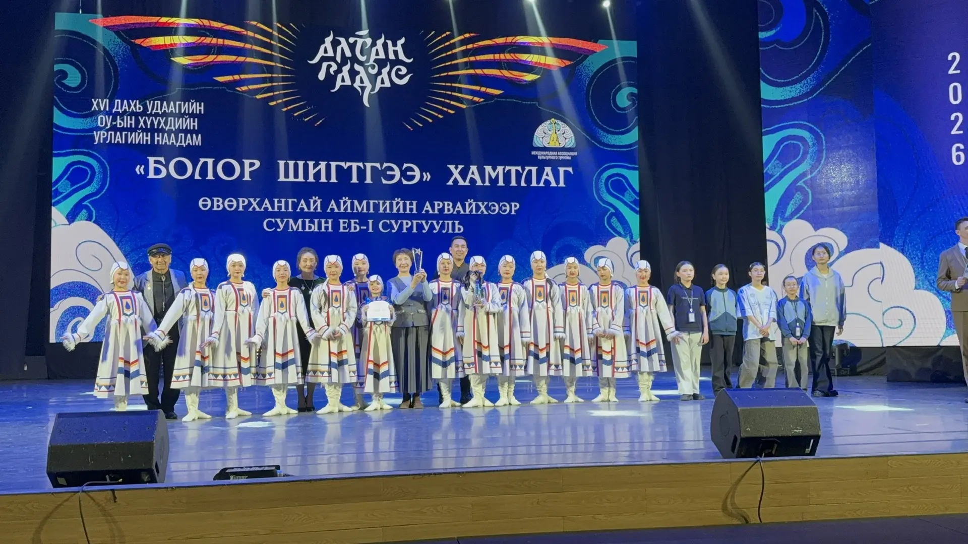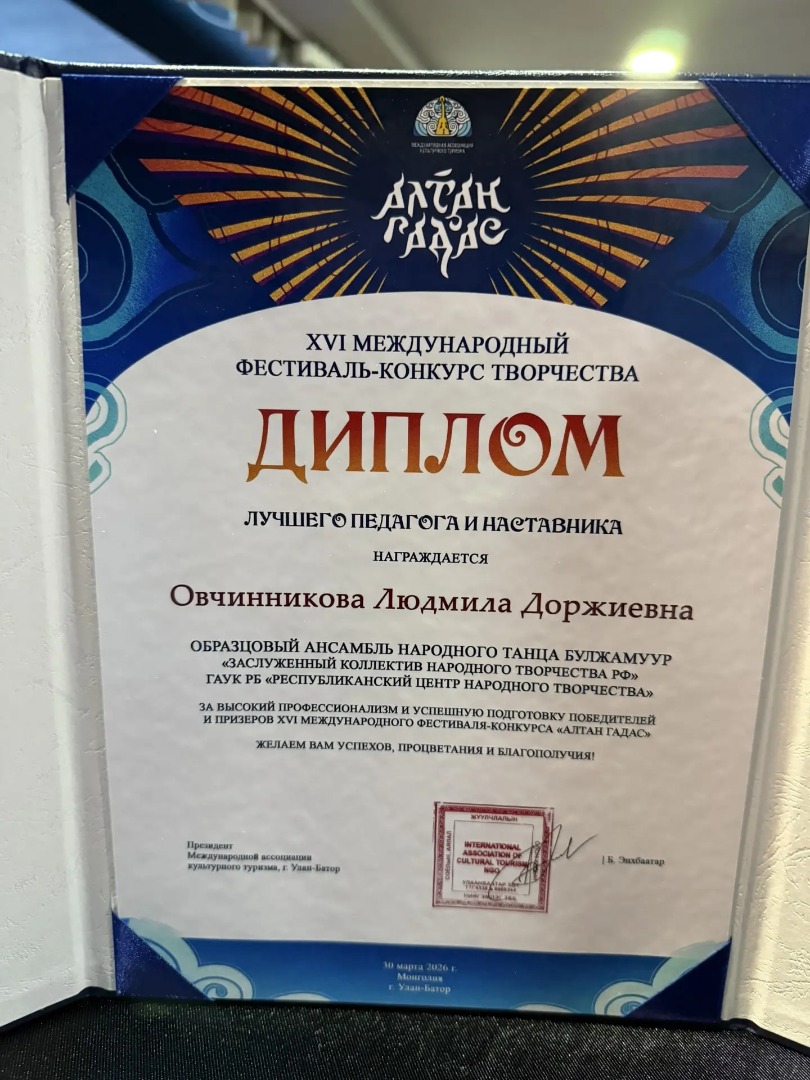 Заслуженный коллектив народного творчества РФ, Образцовый ансамбль народного танца «Булжамуур» Центра народного творчества Бурятии* успешно выступил на XVI Международном фестивале-конкурсе творчества «Алтан Гадас» (с монг. «Полярная звезда»), который проходит в Улан-Баторе (Монголия) с 29 марта по 4 апреля.