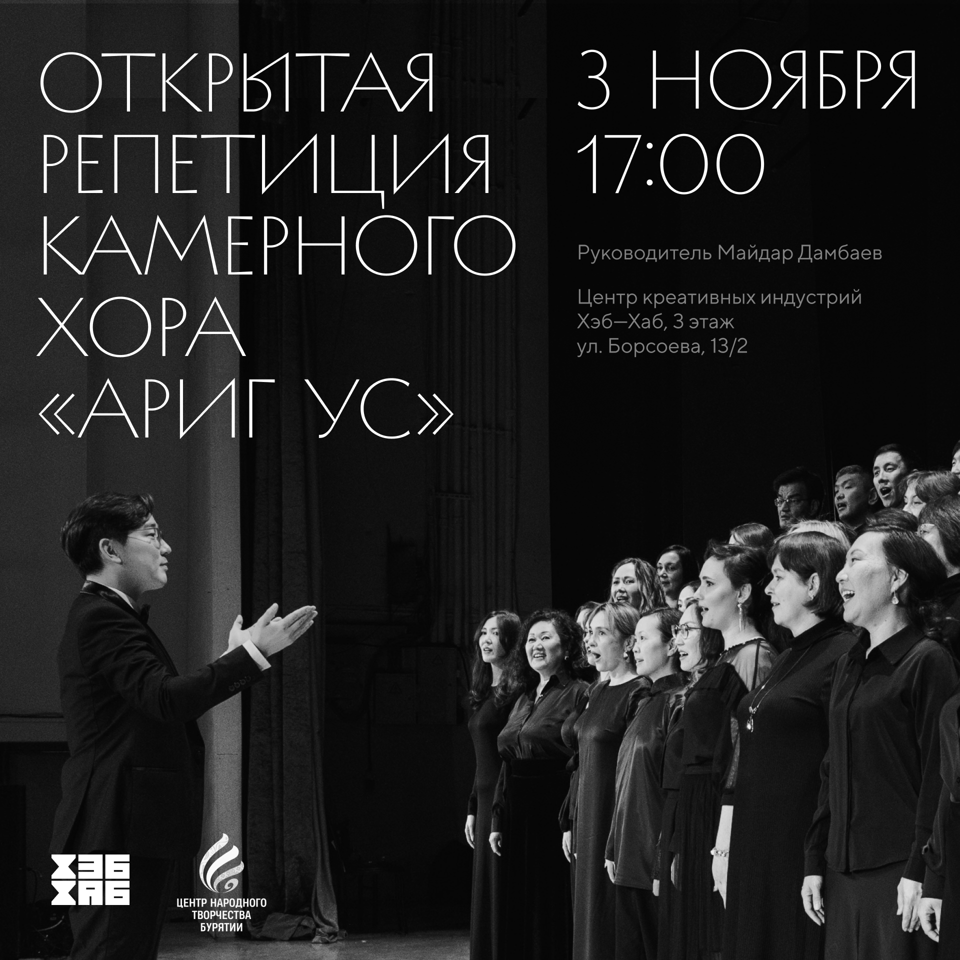 3 ноября в Центре креативных индустрий «Хэб—Хаб» пройдёт открытая репетиция Камерного хора «Ариг Ус» Республиканского центра народного творчества*.