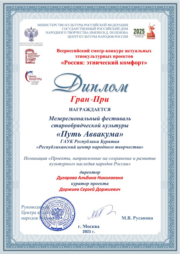Межрегиональный фестиваль «Путь Аввакума»Республиканского центра народного творчества Бурятии* удостоен главной награды — Гран-при Всероссийского смотра-конкурса актуальных этнокультурных проектов «Россия: этнический комфорт – 2025».