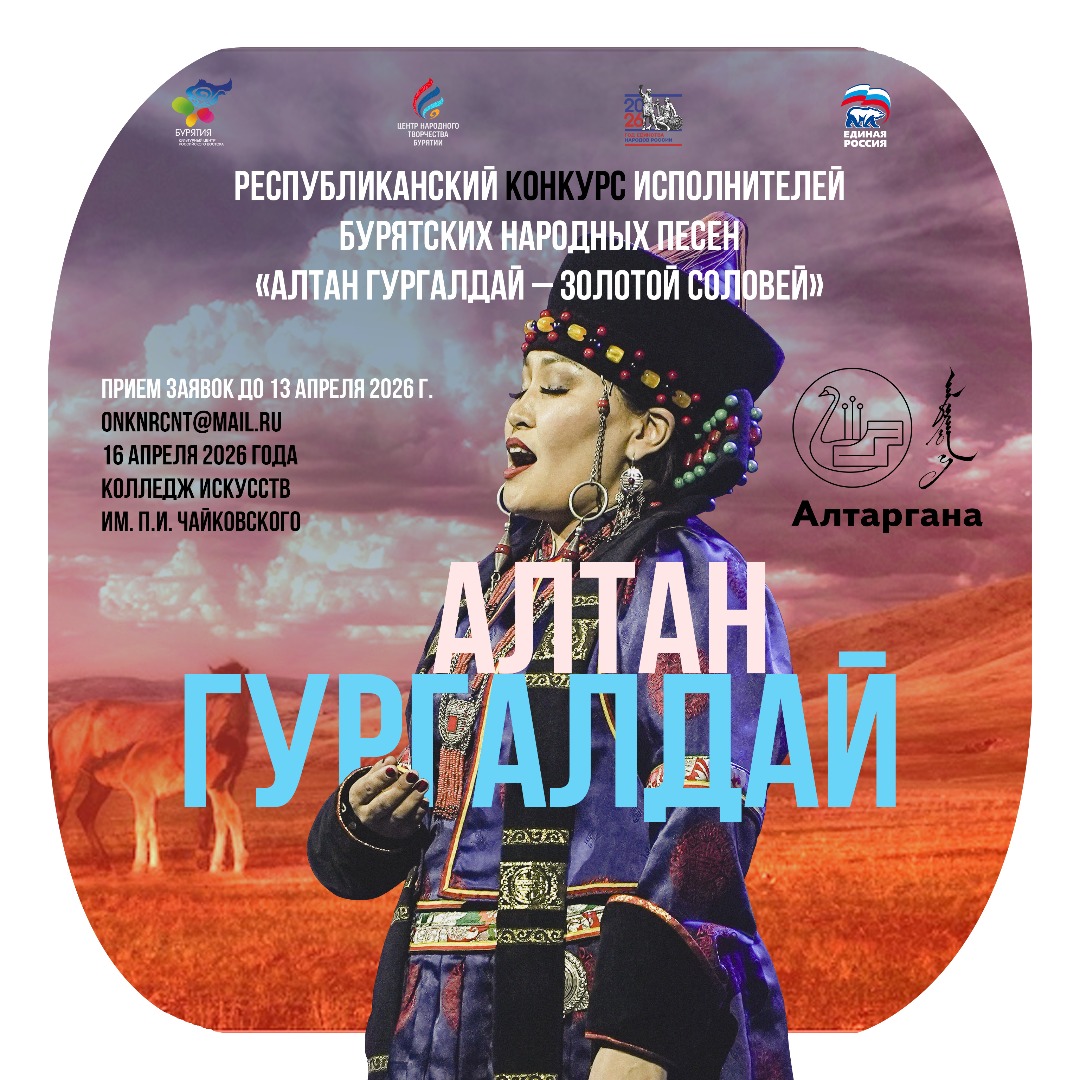 До 13 апреля принимаются заявки на Республиканский конкурс исполнителей бурятской народной песни «Алтан гургалдай – Золотой соловей». Организаторы конкурса –Министерство культуры Республики Бурятия и Республиканский центр народного творчества* приглашают к участию исполнителей народных песен в четырёх возрастных группах: от 10 до 16 лет, от 17 до 35 лет, от 36 до 50 лет и от 51 года и старше.