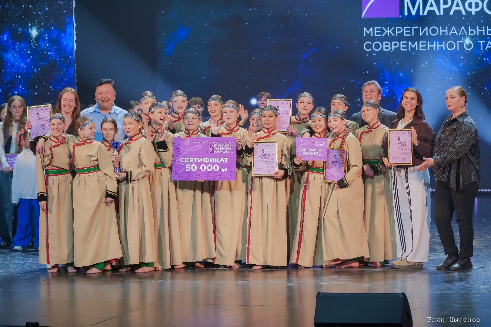 После официальной части состоялось вручение наград победителям. Гран-при марафона получила образцовая студия современного танца «ПИЛЕЯ». Протокол с именами лауреатов и призеров на сайте байкалфолк.рф. Фото Баяна Цыренова по ссылке.